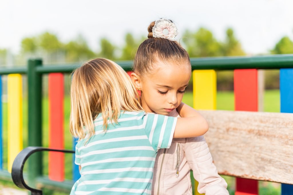 A little caucasian blond boy on his back cuddles and apologizes to his little sister for misbehaving with her outdoors.